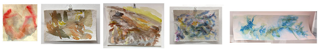 We werken met verf (waterverf & acrylverf) op opgespannen papier. Sommige werken zullen een aantal lessen nodig hebben om tot volle wasdom te komen.